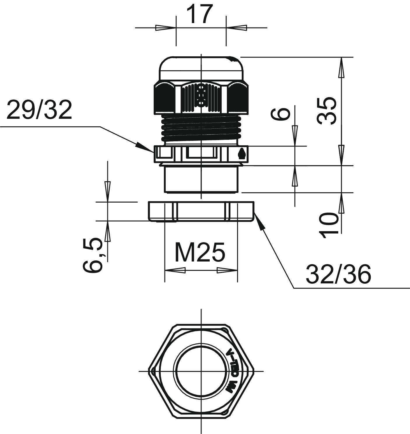 Robust cap nut cable gland with metric connecting thread to IEC 423, including pre-mounted locknut.