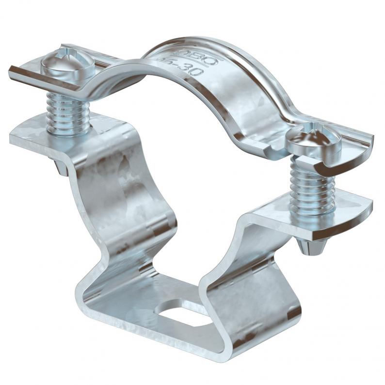 Spacer clip for the installation of pipes and cables on walls, ceilings and floors. With self-locking cover. Fastening via slot.
