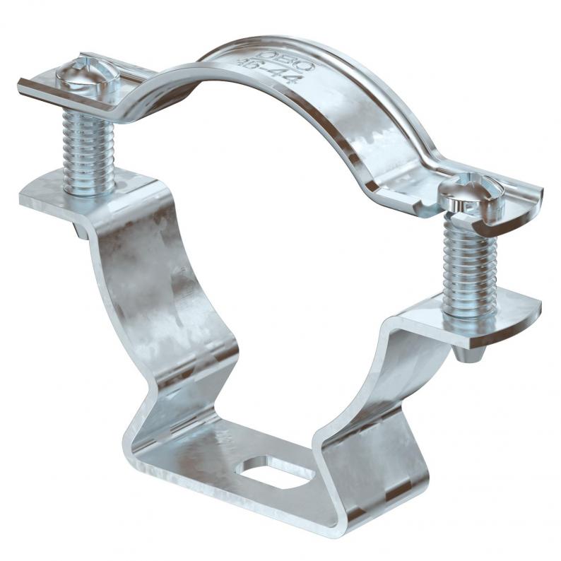 Spacer clip for the installation of pipes and cables on walls, ceilings and floors. With self-locking cover. Fastening via slot.