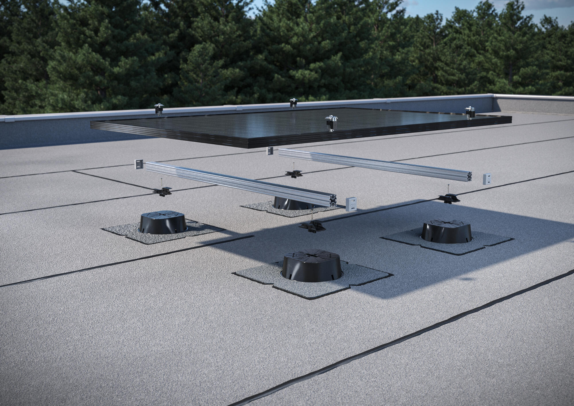The Magic PV Flat Glue universal base can be used as a ballast-free PV mounting system up to a maximum of 5° (corresponding to approx. 8%) on bitumen seals and up to a maximum of 10° (corresponding to approx. 17%) on plastic roof membranes. Its use on pitched roofs with a significant slope is only possible following consultation with OBO and a static analysis. In line with the OBO standard, it is mounted parallel to the roof. A stand-off design may also be possible after consultation with OBO. A static analysis should be performed first in this case as well. For specific project requirements, our Technical Office will be happy to help and assist you during planning – and also work closely with you to find just the right solution for your needs.