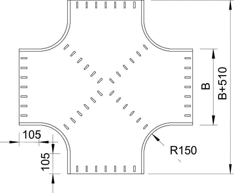 Fitting in round design. The interior radius of the fitting is 150 mm. All the sides are designed for the same cable tray width.