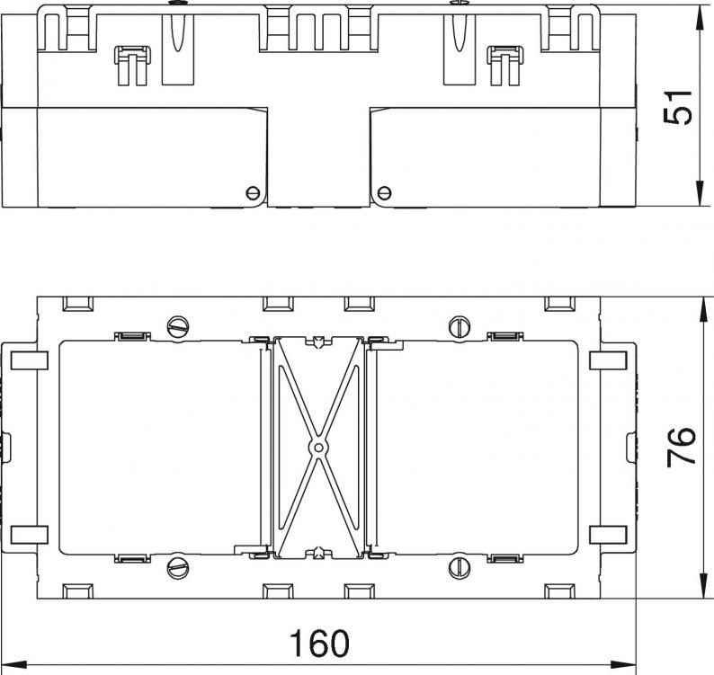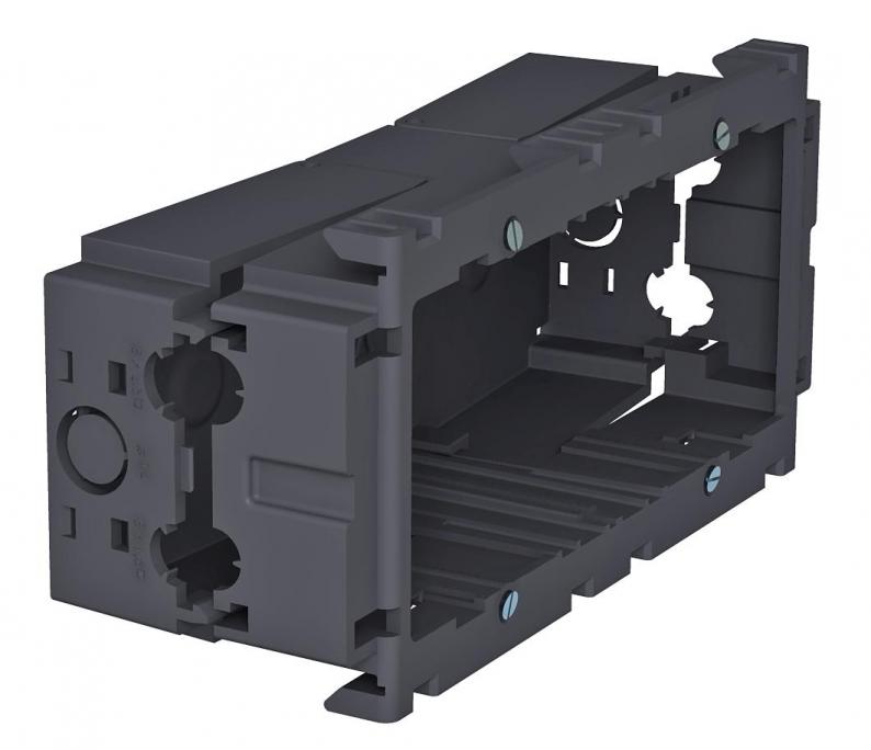 Front locking accessory mounting box for standard switch ranges for the installation of two individual installation devices or a multiple protective contact socket. With unfolding, and also removable, base for time-saving cable connection and with feed openings for cable diameters of up to 14 mm. Halogen-free version.