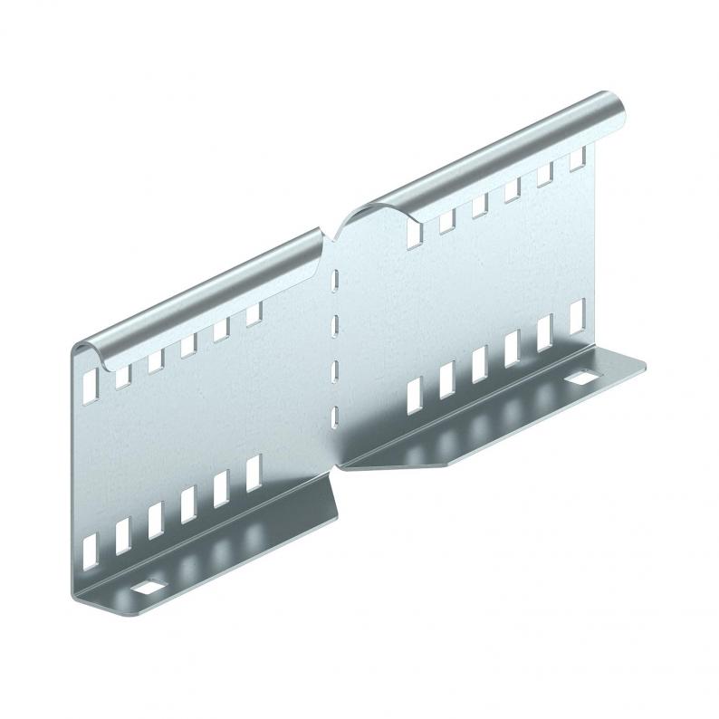 Angle connector as external connector to join cable ladders and fittings with a side height of 100 mm and continuous rail perforation.