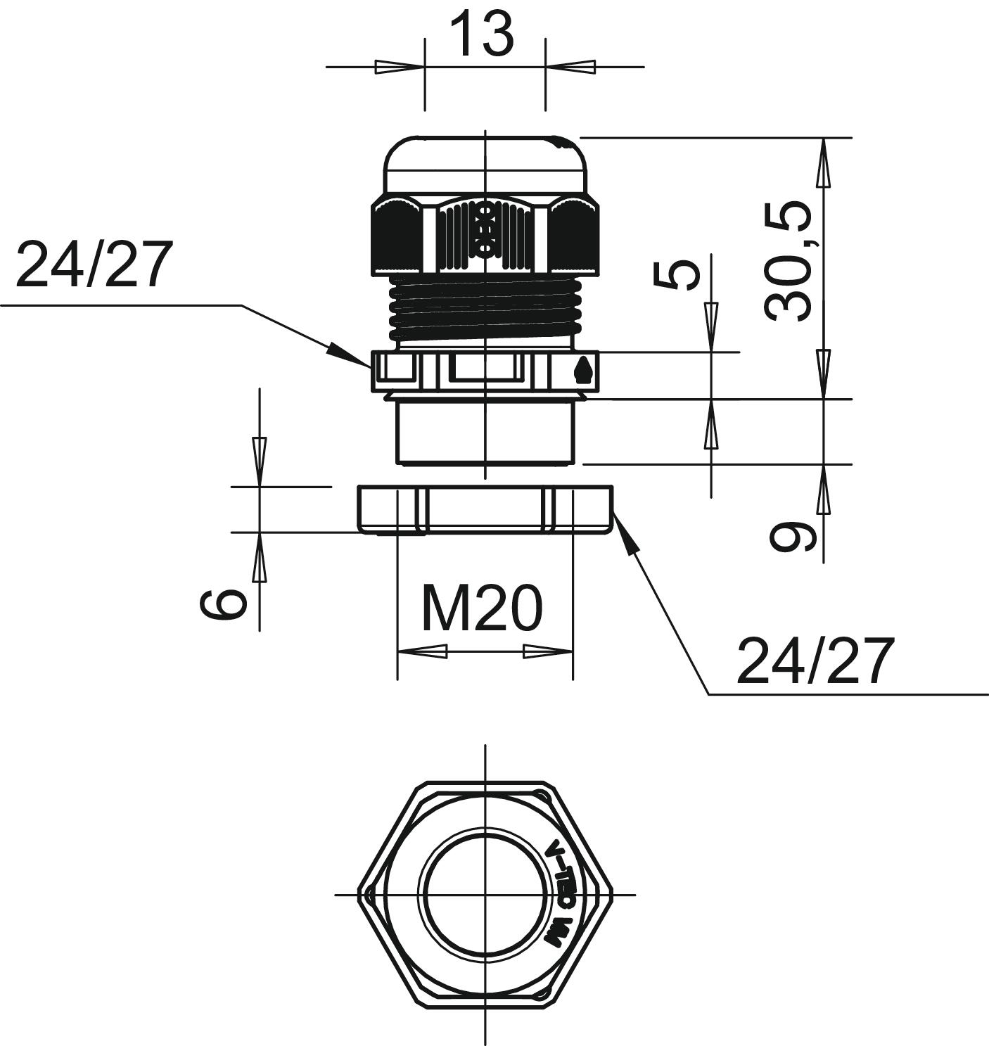 Robust cap nut cable gland with metric connecting thread to IEC 423, including pre-mounted locknut.