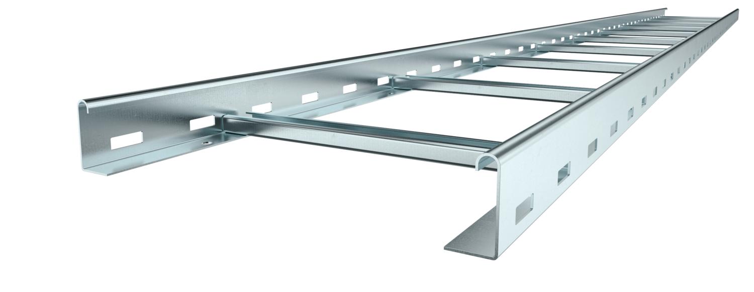 Cable ladder with perforated side rail of side height 50 mm with riveted C profile rungs, open in an upwards direction. Assignment of the rungs on both sides possible using U clamps.
