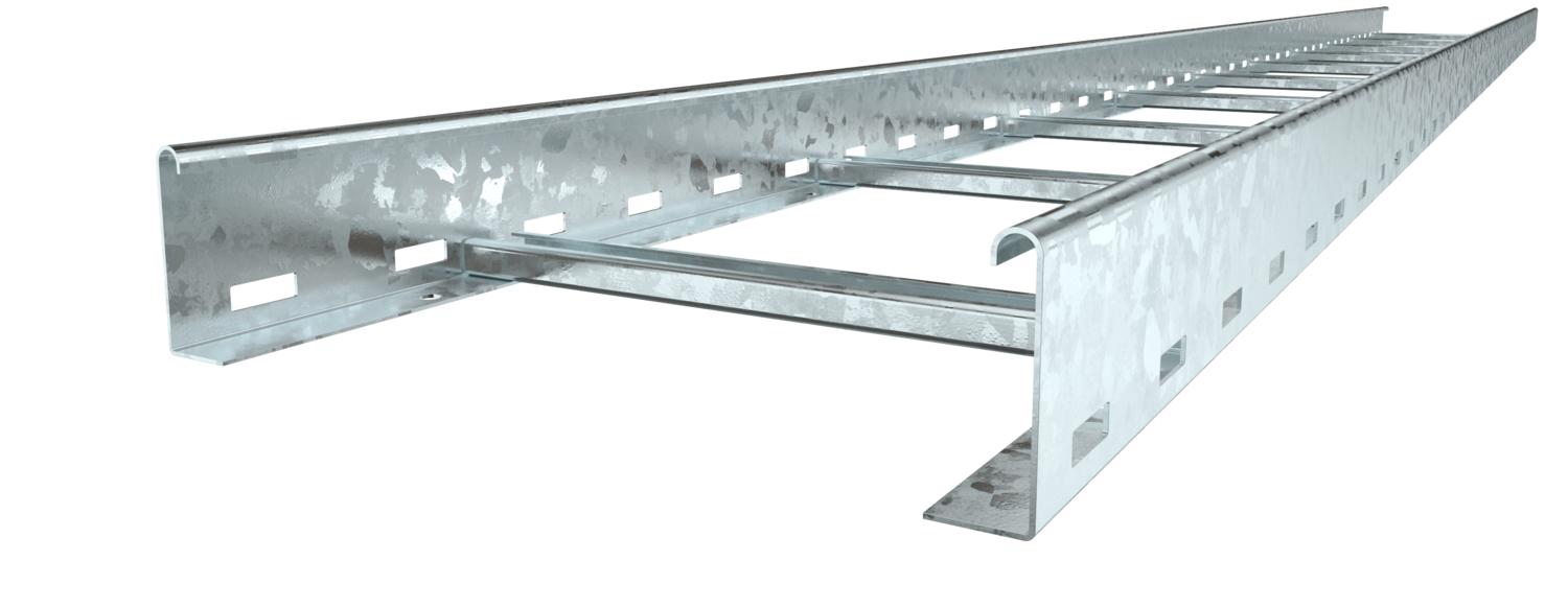 Cable ladder with perforated side rail of side height 75 mm with riveted C profile rungs, open in an upwards direction. Assignment of the rungs on both sides possible using U clamps.