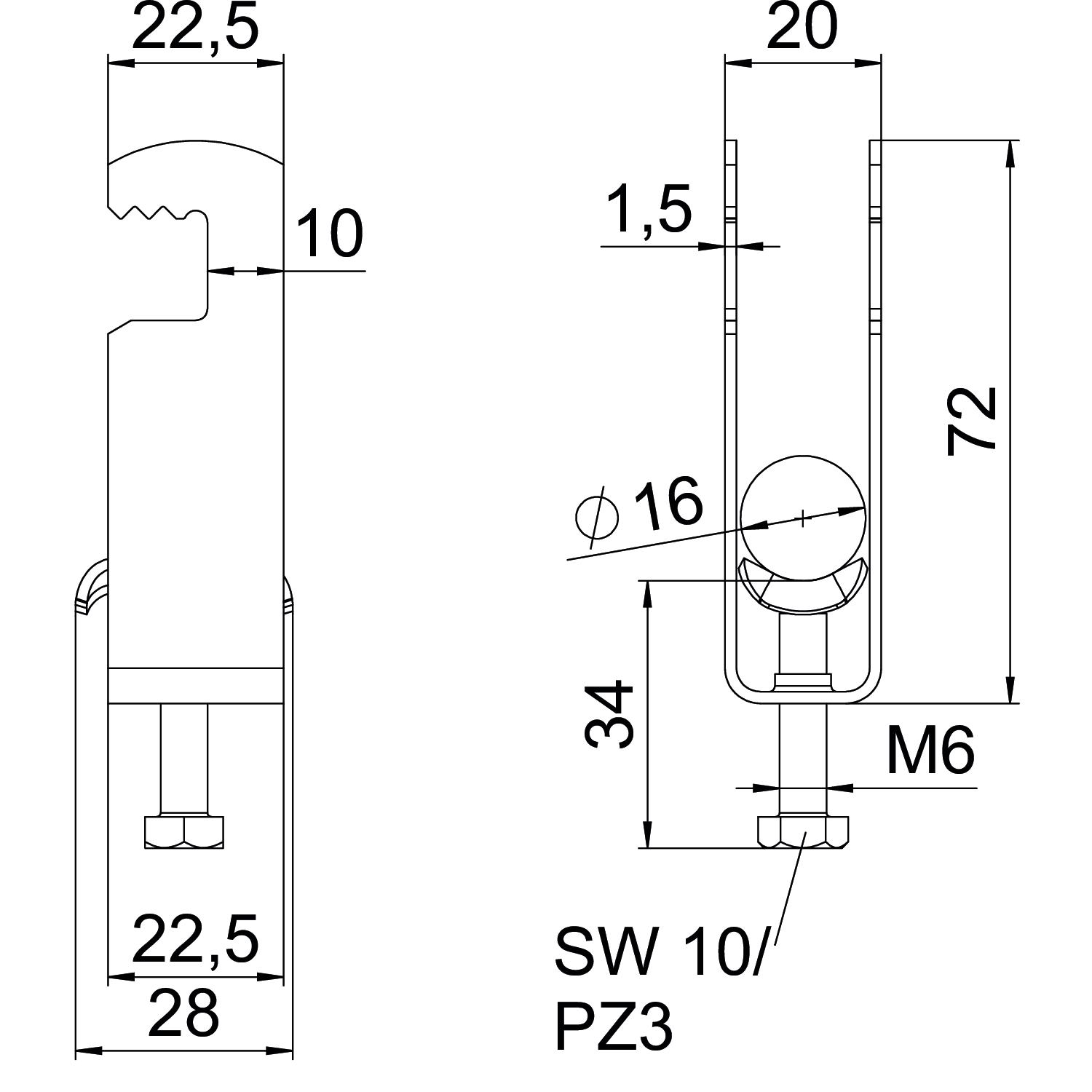 Clamp clip with F-foot, metal pressure sleeve with rounded edges to protect the cable. For vertical and horizontal mounting of 2 single cables on flat bars. With 1-start screw thread on pressure sleeve, universal hexagonal screw head WAF10, with slot and cross recess. Suitable for assembly indoors and outdoors. Multiple cables should be separated by double sleeves. We recommend the use of a counter-sleeve.