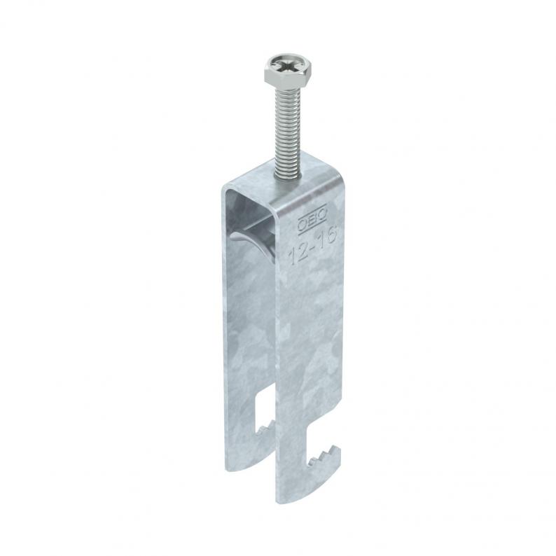 Clamp clip with F-foot, metal pressure trough with rounded edges to protect the cable. For vertical and horizontal mounting of 3 single cables on flat bars. With 1-start screw thread on pressure trough, universal hexagonal screw head WAF10, with slot and cross recess. Suitable for mounting indoors and outdoors. Multiple cables should be separated by double troughs. We recommend the use of a counter-trough.