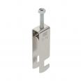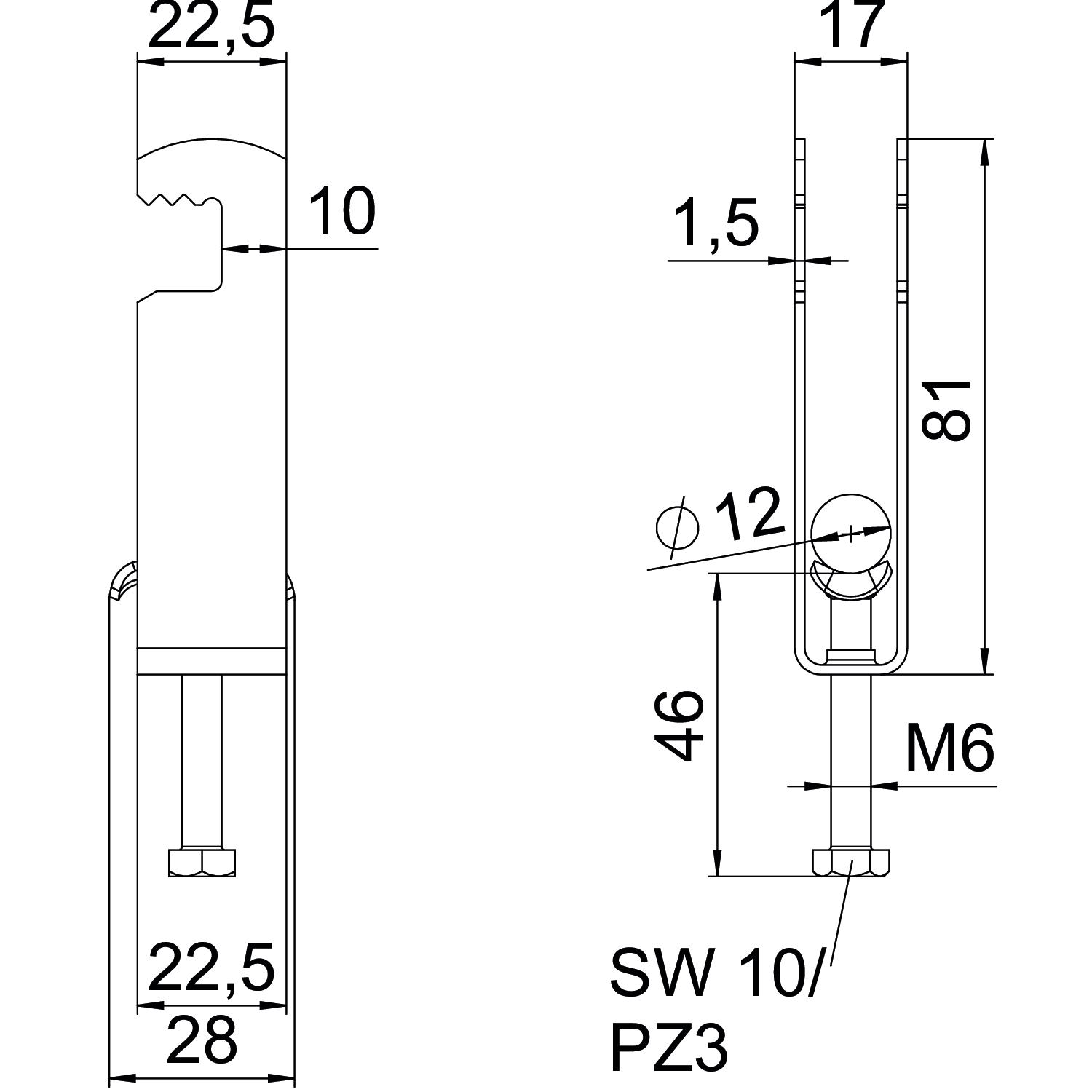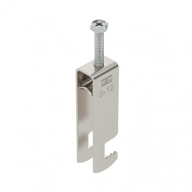 Clamp clip with F-foot, metal pressure trough with rounded edges to protect the cable. For vertical and horizontal mounting of 3 single cables on flat bars. With 1-start screw thread on pressure trough, universal hexagonal screw head WAF10, with slot and cross recess. Suitable for mounting indoors and outdoors. Multiple cables should be separated by double troughs. We recommend the use of a counter-trough.