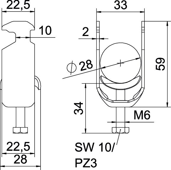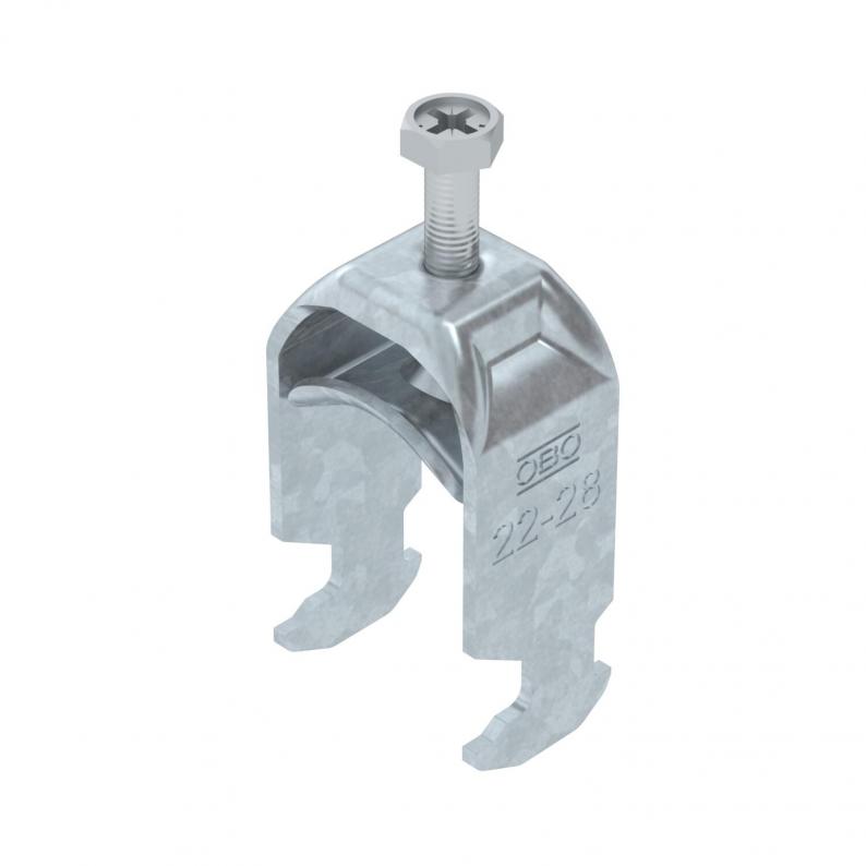 Clamp clip with hammerhead foot, metal pressure sleeve with rounded edges to protect the cable. For vertical and horizontal mounting of 1 single cable on a C-profile rail. For a slot width 16–17 mm. With 1-start screw thread on pressure sleeve, universal hexagonal screw head WAF10, with slot and cross recess. Suitable for assembly indoors and outdoors. The counter-sleeve must be ordered separately.