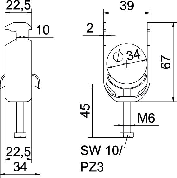 Clamp clip with hammerhead foot, metal pressure sleeve with rounded edges to protect the cable. For vertical and horizontal mounting of 1 single cable on a C-profile rail. For a slot width 16–17 mm. With 1-start screw thread on pressure sleeve, universal hexagonal screw head WAF10, with slot and cross recess. Suitable for assembly indoors and outdoors. The counter-sleeve must be ordered separately.