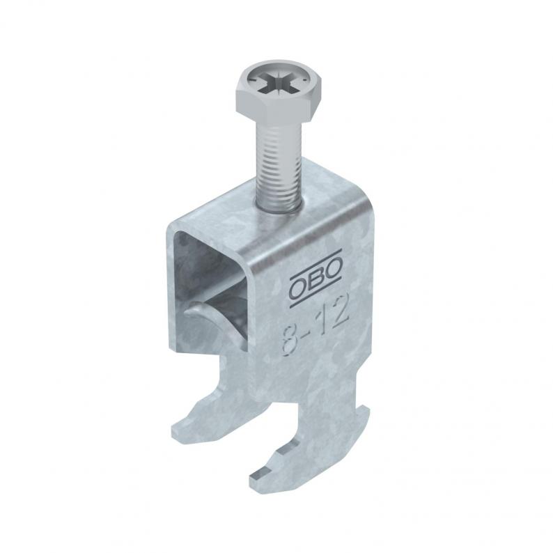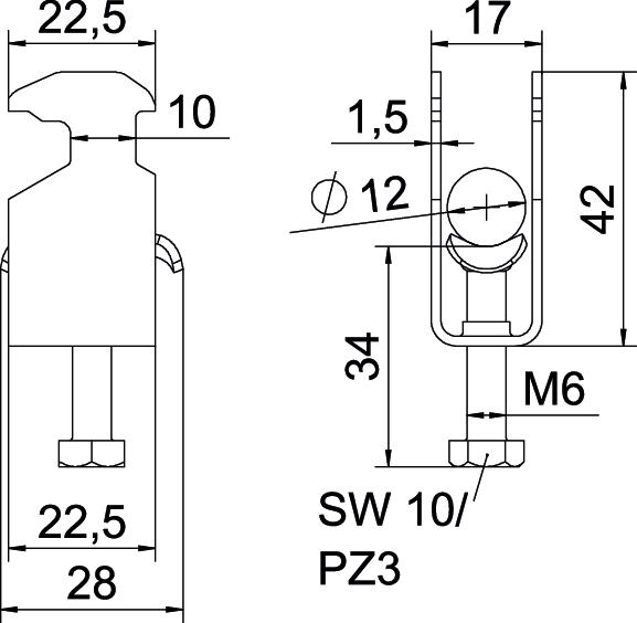 Clamp clip with hammerhead foot, metal pressure sleeve with rounded edges to protect the cable. For vertical and horizontal mounting of 1 single cable on a C-profile rail. For a slot width 16–17 mm. With 1-start screw thread on pressure sleeve, universal hexagonal screw head WAF10, with slot and cross recess. Suitable for assembly indoors and outdoors. The counter-sleeve must be ordered separately.