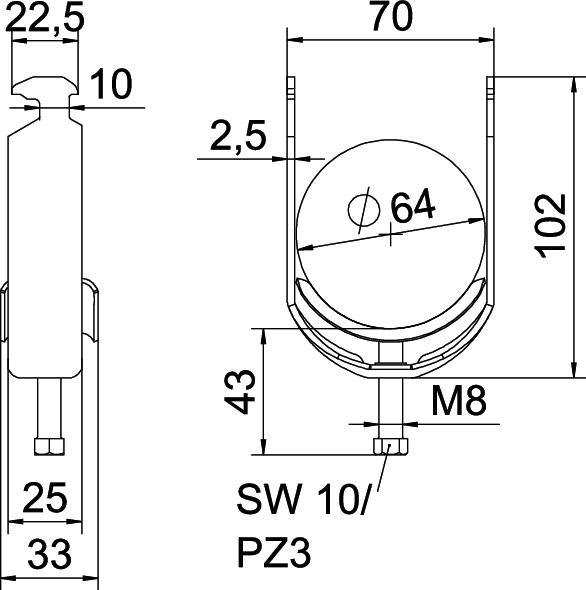 Clamp clip with hammerhead foot, metal pressure sleeve with rounded edges to protect the cable. For vertical and horizontal mounting of 1 single cable on a C-profile rail. For a slot width 16–17 mm. With 1-start screw thread on pressure sleeve, universal hexagonal screw head WAF10, with slot and cross recess. Suitable for assembly indoors and outdoors. The counter-sleeve must be ordered separately.