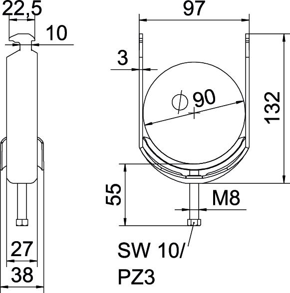 Clamp clip with hammerhead foot, metal pressure sleeve with rounded edges to protect the cable. For vertical and horizontal mounting of 1 single cable on a C-profile rail. For a slot width 16–17 mm. With 1-start screw thread on pressure sleeve, universal hexagonal screw head WAF10, with slot and cross recess. Suitable for assembly indoors and outdoors. The counter-sleeve must be ordered separately.