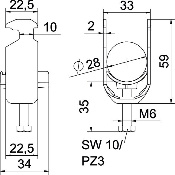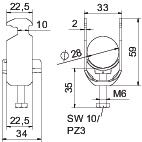 Clamp clip with hammerhead foot, plastic pressure sleeve made of polypropylene. For vertical and horizontal mounting of 1 single cable on a C-profile rail. For a slot width 16–17 mm. With 1-start screw thread on pressure sleeve, universal hexagonal screw head WAF10, with slot and cross recess. Suitable for assembly indoors and outdoors. We recommend the use of a counter-sleeve.