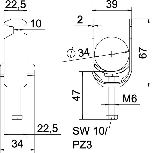 Clamp clip with hammerhead foot, plastic pressure sleeve made of polypropylene. For vertical and horizontal mounting of 1 single cable on a C-profile rail. For a slot width 16–17 mm. With 1-start screw thread on pressure sleeve, universal hexagonal screw head WAF10, with slot and cross recess. Suitable for assembly indoors and outdoors. We recommend the use of a counter-sleeve.