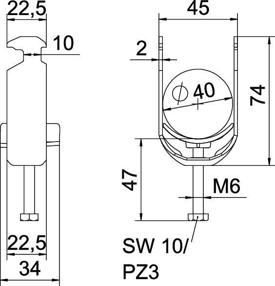 Clamp clip with hammerhead foot, plastic pressure sleeve made of polypropylene. For vertical and horizontal mounting of 1 single cable on a C-profile rail. For a slot width 16–17 mm. With 1-start screw thread on pressure sleeve, universal hexagonal screw head WAF10, with slot and cross recess. Suitable for assembly indoors and outdoors. We recommend the use of a counter-sleeve.