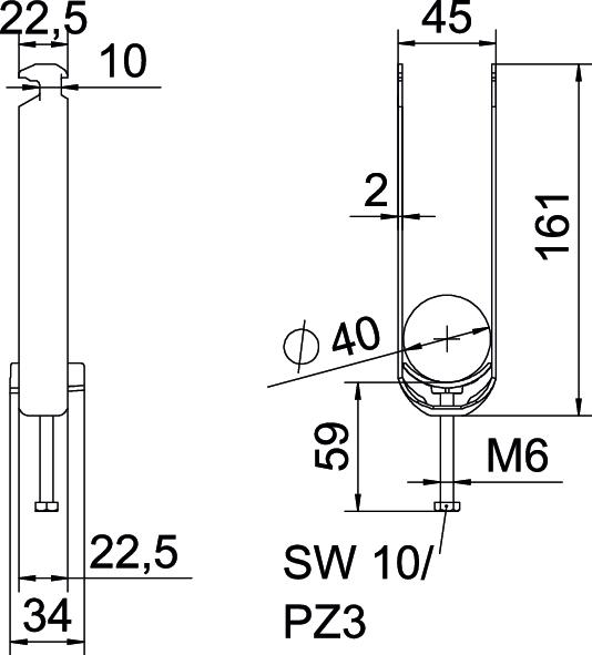 Clamp clip with hammerhead foot, plastic pressure sleeve made of polypropylene. For vertical and horizontal mounting of 3 single cables on a C-profile rail. For a slot width 16–17 mm. With 1-start screw thread on pressure sleeve, universal hexagonal screw head WAF10, with slot and cross recess. Suitable for assembly indoors and outdoors. Multiple cables should be separated by double sleeves. We recommend the use of a counter-sleeve.