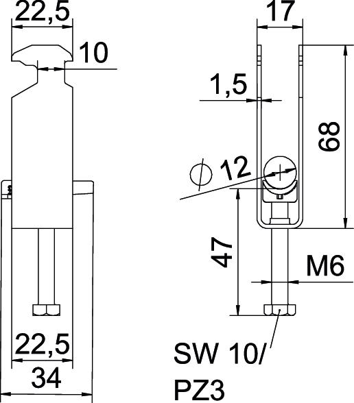 Clamp clip with hammerhead foot, plastic pressure sleeve made of polypropylene. For vertical and horizontal mounting of 3 single cables on a C-profile rail. For a slot width 16–17 mm. With 1-start screw thread on pressure sleeve, universal hexagonal screw head WAF10, with slot and cross recess. Suitable for assembly indoors and outdoors. Multiple cables should be separated by double sleeves. We recommend the use of a counter-sleeve.