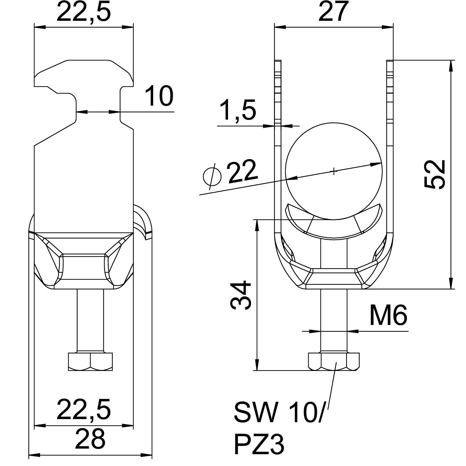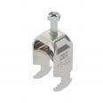 Clamp clip with hammerhead foot, metal pressure trough with rounded edges to protect the cable. For vertical and horizontal mounting of 1 single cable on a C-profile rail. For a slot width of 16–17 mm. With 1-start screw thread on pressure trough, universal hexagonal screw head WAF10, with slot and cross recess. Suitable for mounting indoors and outdoors. We recommend the use of a counter-trough.