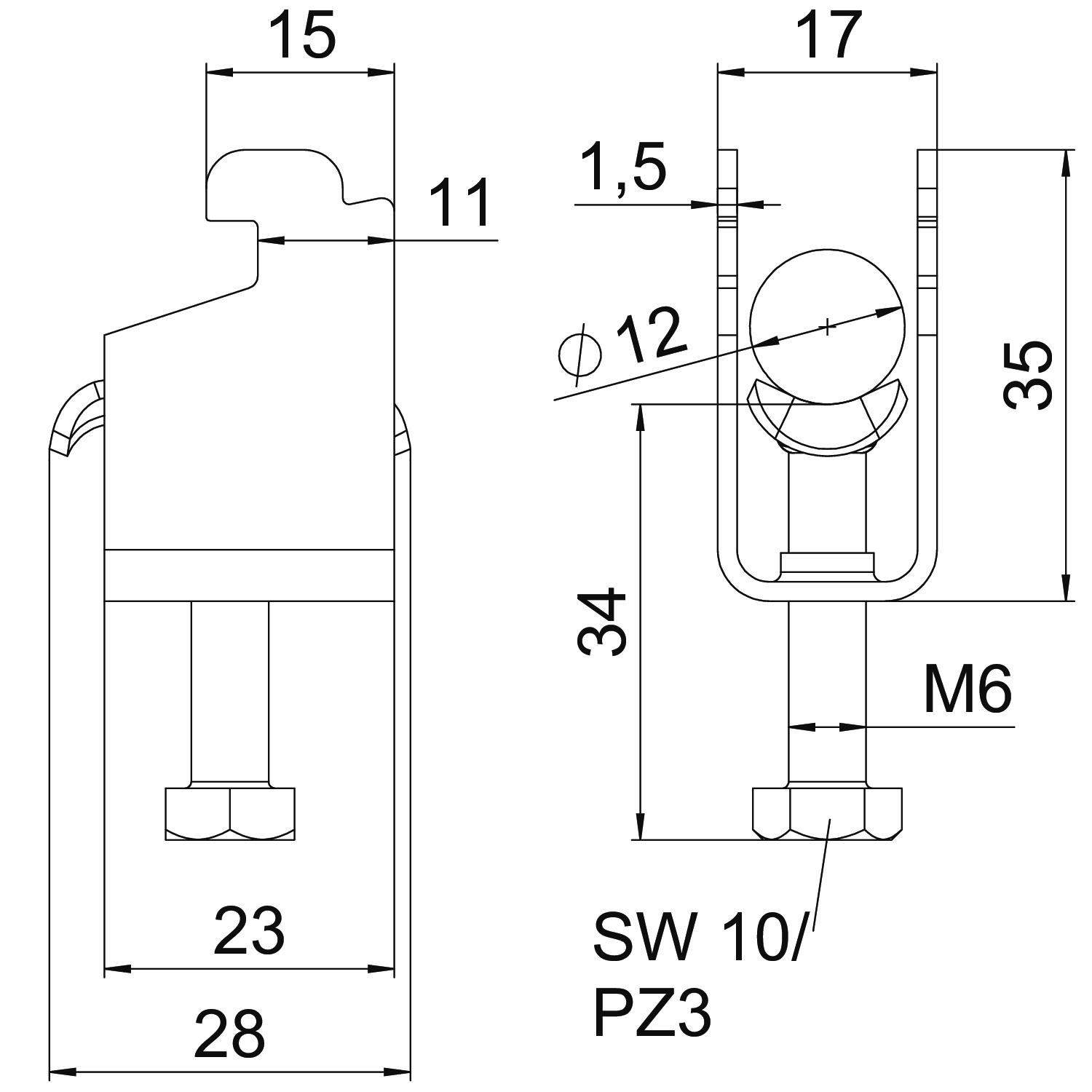 Clamp clip with N-foot, metal pressure sleeve with rounded edges to protect the cable. For vertical and horizontal mounting of 1 single cable on a C-profile rail. For slot width 11‒12 mm With 1-start screw thread on pressure sleeve, universal hexagonal screw head WAF10, with slot and cross recess. Suitable for assembly indoors and outdoors. We recommend the use of a counter-sleeve.