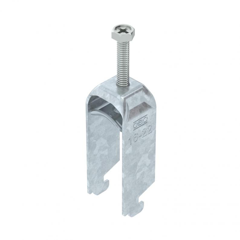 Clamp clip with N-foot, metal pressure sleeve with rounded edges to protect the cable. For vertical and horizontal mounting of 2 single cables on a C-profile rail. For slot width 11‒12 mm With 1-start screw thread on pressure sleeve, universal hexagonal screw head WAF10, with slot and cross recess. Suitable for assembly indoors and outdoors. Multiple cables should be separated by double sleeves. We recommend the use of a counter-sleeve.