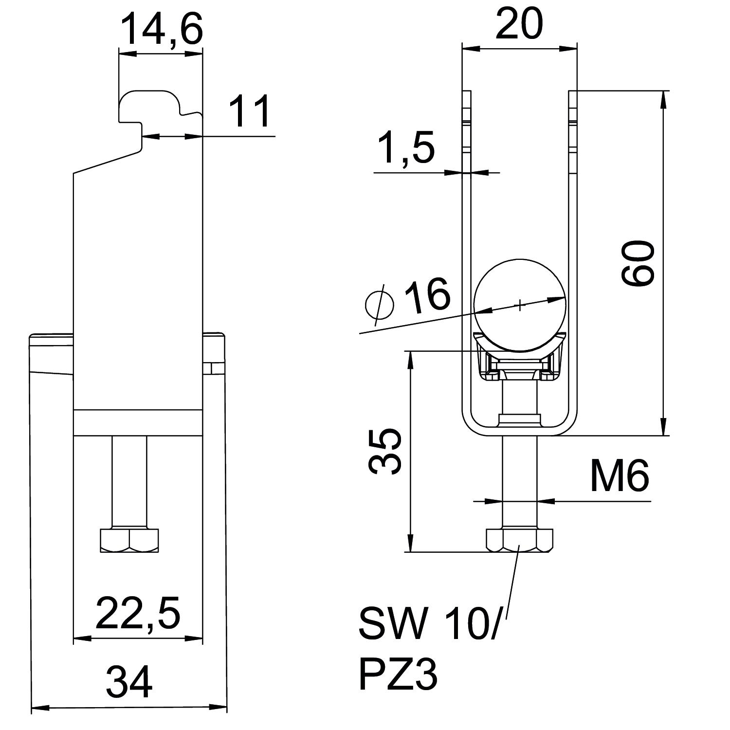 Clamp clip with N-foot, plastic pressure sleeve made of polypropylene. For vertical and horizontal mounting of 2 single cables on a C-profile rail. For slot width 11‒12 mm With 1-start screw thread on pressure sleeve, universal hexagonal screw head WAF10, with slot and cross recess. Suitable for assembly indoors and outdoors. Multiple cables should be separated by double sleeves. We recommend the use of a counter-sleeve.