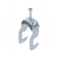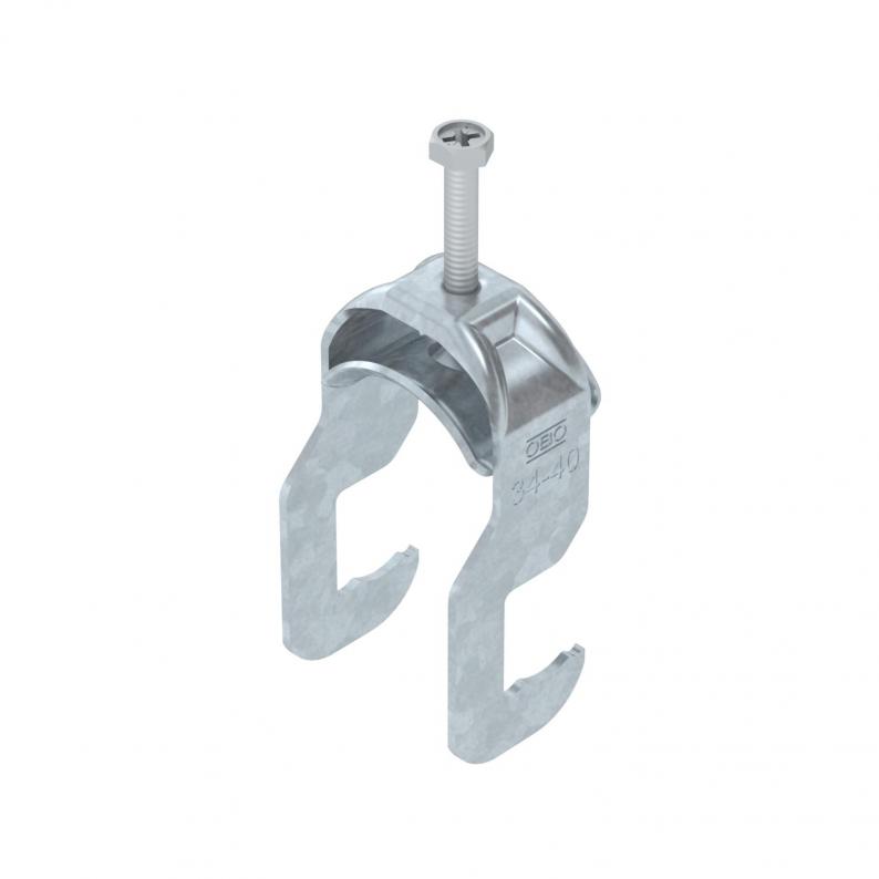 Clamp clip with RS foot, metal pressure sleeve with rounded edges to protect the cable. For vertical and horizontal mounting of 1 single cable on round profiles or pipes. With 1-start screw thread on pressure sleeve, universal hexagonal screw head WAF10, with slot and cross recess. Suitable for all round profile irons or pipes with diameters up to 22 mm. Suitable for mounting indoors and outdoors. We recommend the use of a counter-trough.
