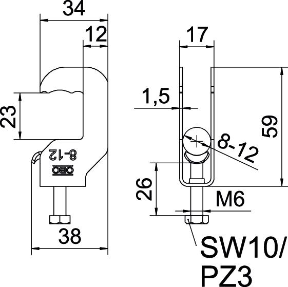Clamp clip with RS foot, metal pressure sleeve with rounded edges to protect the cable. For vertical and horizontal mounting of 1 single cable on round profiles or pipes. With 1-start screw thread on pressure sleeve, universal hexagonal screw head WAF10, with slot and cross recess. Suitable for all round profile irons or pipes with diameters up to 22 mm. Suitable for mounting indoors and outdoors. We recommend the use of a counter-trough.