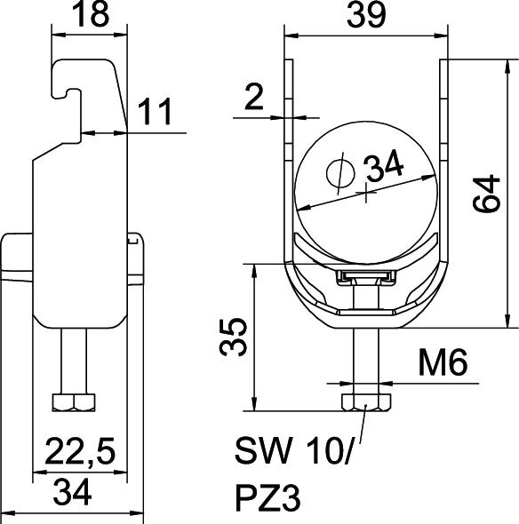 Clamp clip with U-foot, plastic pressure sleeve made of polypropylene. For vertical and horizontal mounting of 1 single cable on a C-profile rail. For slot width 18–22 mm. With 1-start screw thread on pressure sleeve, universal hexagonal screw head WAF10, with slot and cross recess. Suitable for assembly indoors and outdoors. We recommend the use of a counter-sleeve.