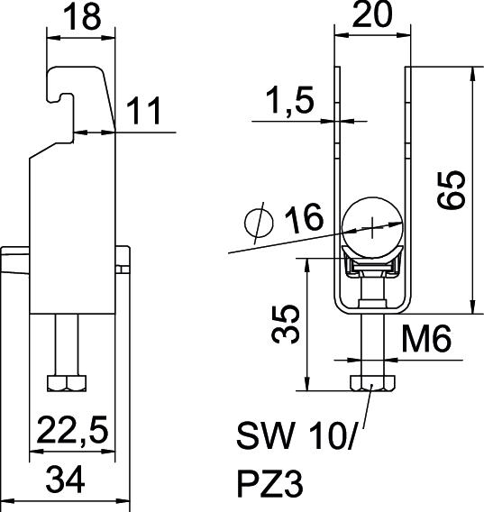 Clamp clip with U-foot, plastic pressure sleeve made of polypropylene. For vertical and horizontal mounting of 2 single cables on a C-profile rail. For slot width 18–22 mm. With 1-start screw thread on pressure sleeve, universal hexagonal screw head WAF10, with slot and cross recess. Suitable for assembly indoors and outdoors. Multiple cables should be separated by double sleeves. We recommend the use of a counter-sleeve.