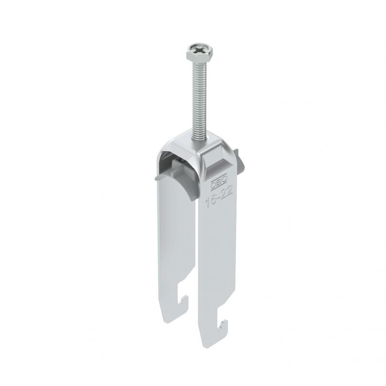 Clamp clip with U-foot, plastic pressure sleeve made of polypropylene. For vertical and horizontal mounting of 3 single cables on a C-profile rail. For slot width 18–22 mm. With 1-start screw thread on pressure sleeve, universal hexagonal screw head WAF10, with slot and cross recess. Suitable for assembly indoors and outdoors. Multiple cables should be separated by double sleeves. We recommend the use of a counter-sleeve.