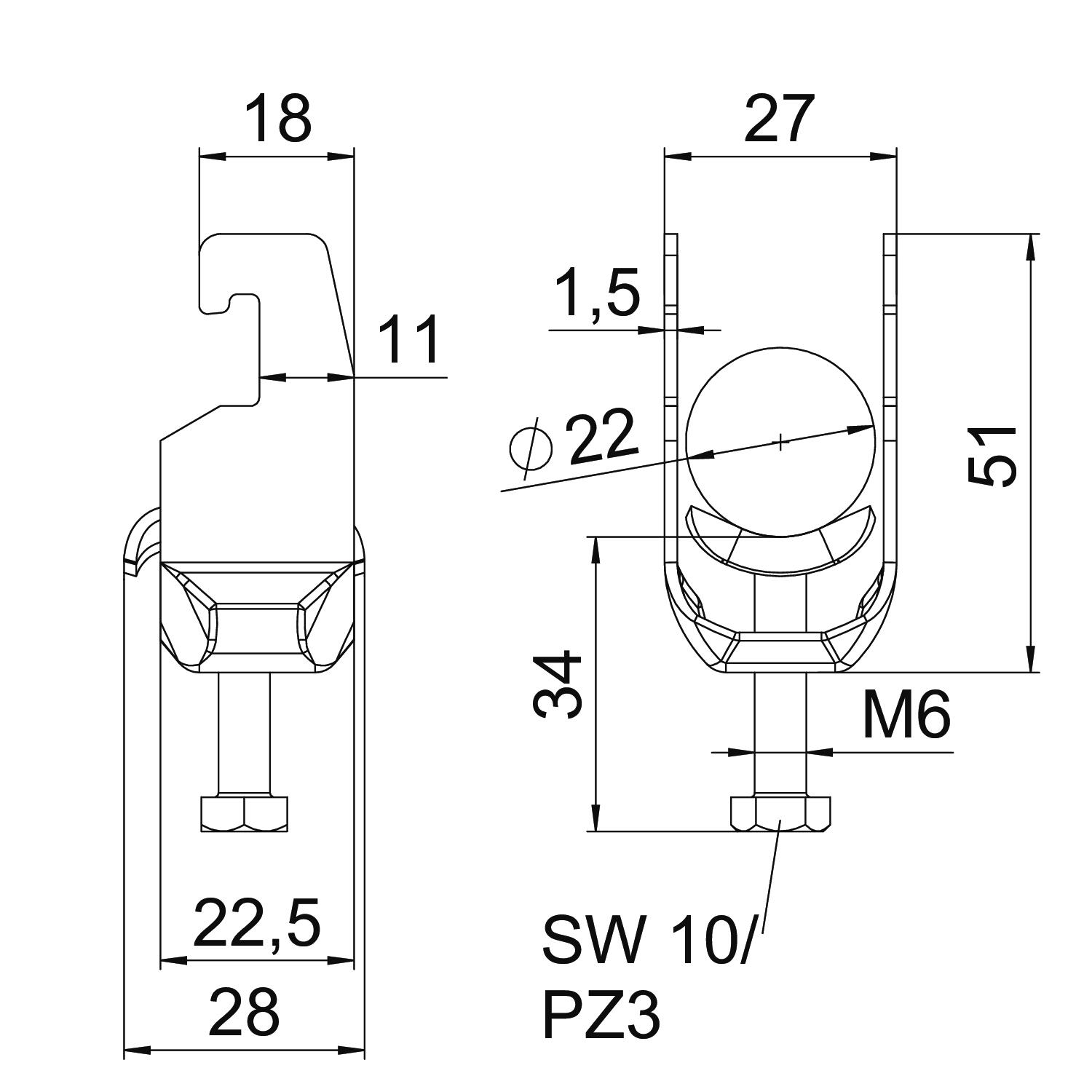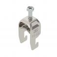 Clamp clip with U-foot, metal pressure trough with rounded edges to protect the cable. For vertical and horizontal mounting of 1 single cable on a C-profile rail. For slot width 18–22 mm. With 1-start screw thread on pressure trough, universal hexagonal screw head WAF10, with slot and cross recess. Suitable for mounting indoors and outdoors. We recommend the use of a counter-trough.