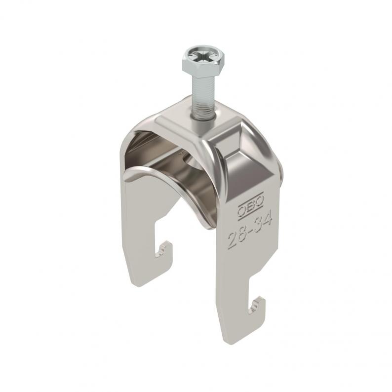 Clamp clip with U-foot, metal pressure trough with rounded edges to protect the cable. For vertical and horizontal mounting of 1 single cable on a C-profile rail. For slot width 18–22 mm. With 1-start screw thread on pressure trough, universal hexagonal screw head WAF10, with slot and cross recess. Suitable for mounting indoors and outdoors. We recommend the use of a counter-trough.