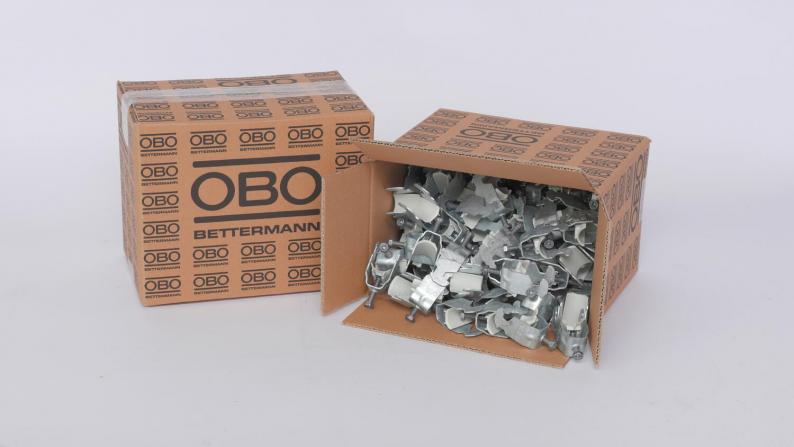 Hot-dip galvanised steel clip and bolt, polypropylene pressure trough, halogen-free, colour light grey RAL 7035.