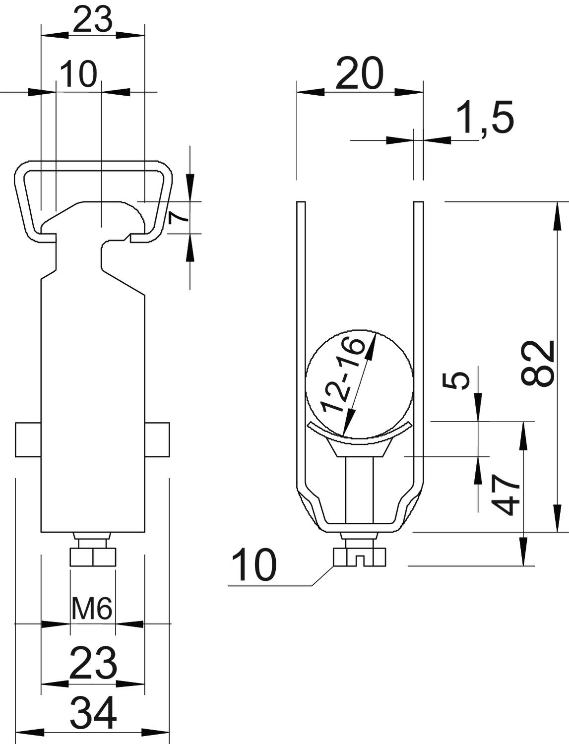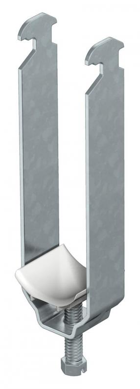 Hot-dip galvanised steel clamp and bolt, polypropylene pressure trough, halogen-free, colour light grey RAL 7035.