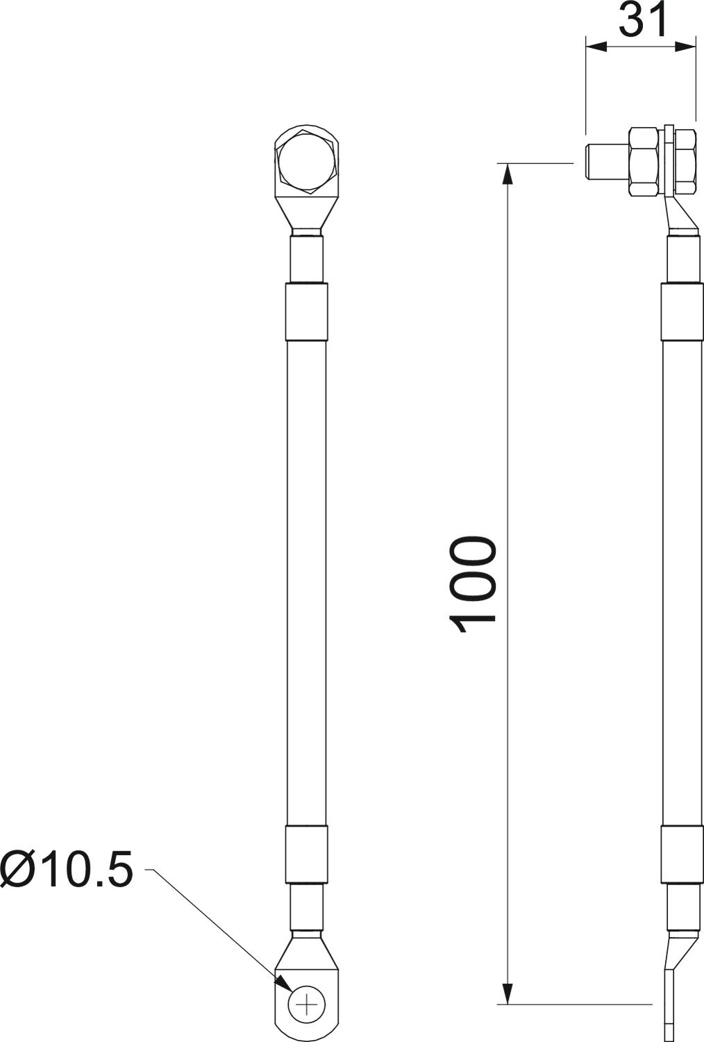 UV-resistant connection cable (copper 25 mm²) for mounting the OBO Ex spark gap, type EX ISG, on insulating flanges and insulating pieces. With cable shoe for M10 bolts on both sides, on one side with M10 bolt, nuts and spring ring.