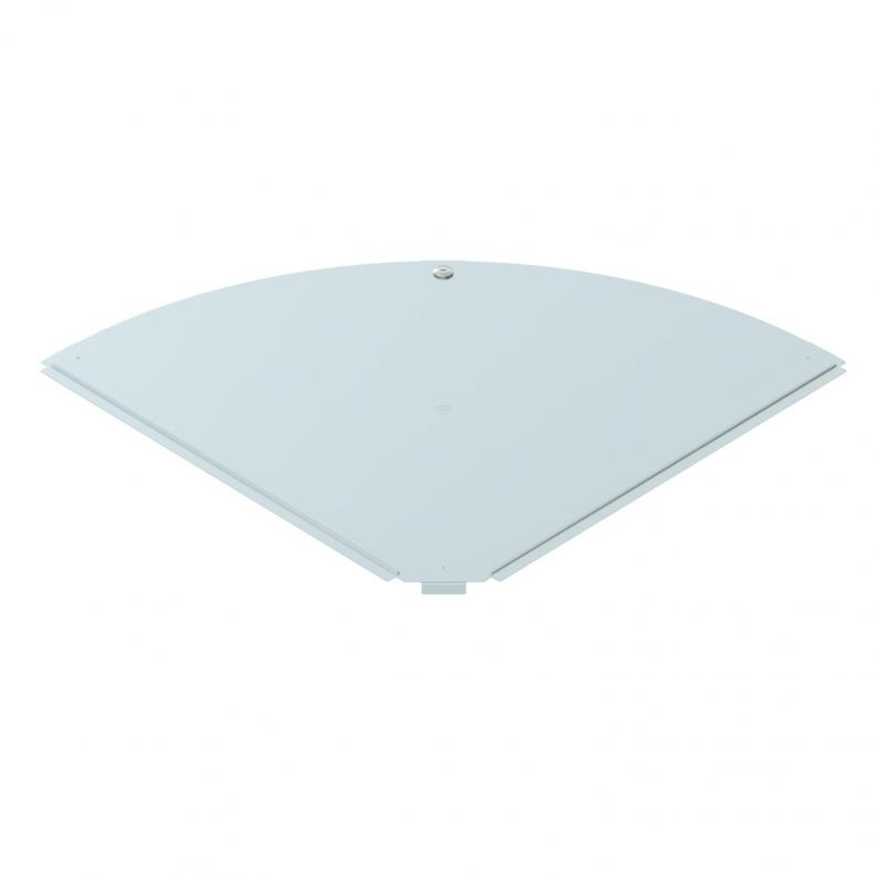 Cover for 90° bend fitting for lockable and screw-on cable trays in indoor areas, to protect cables against damage and soiling. Fastening with pre-mounted sash lock and through attachment of the section cover. Suitable for all side heights.