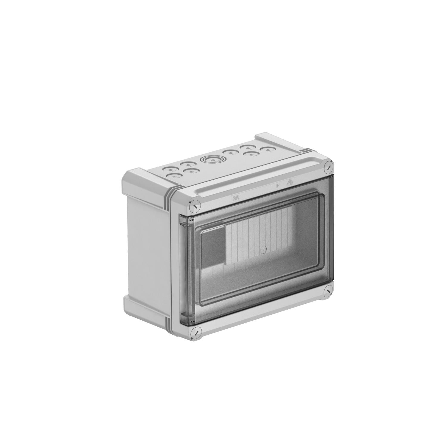Small distributor for surface mounting, for the current sub-distribution in interior and exterior areas, according to IEC 439-3. With pre-mounted 35 mm hat profile rail. IP66 protection type and IK08 protection rating. Transparent cover to screw on, with cut-out. Including 4 screw cover caps.