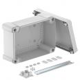 Junction box with hat profile rail for the connection of cables and lines indoors and in outdoor areas. Rectangular design without entries. Suitable for wall and ceiling mounting with the option to fasten outside, inside or to mount via the corner domes. Particularly impact resistant with IK09. Cover with quick lock, sealable. Made from halogen-free and UV-resistant materials.
