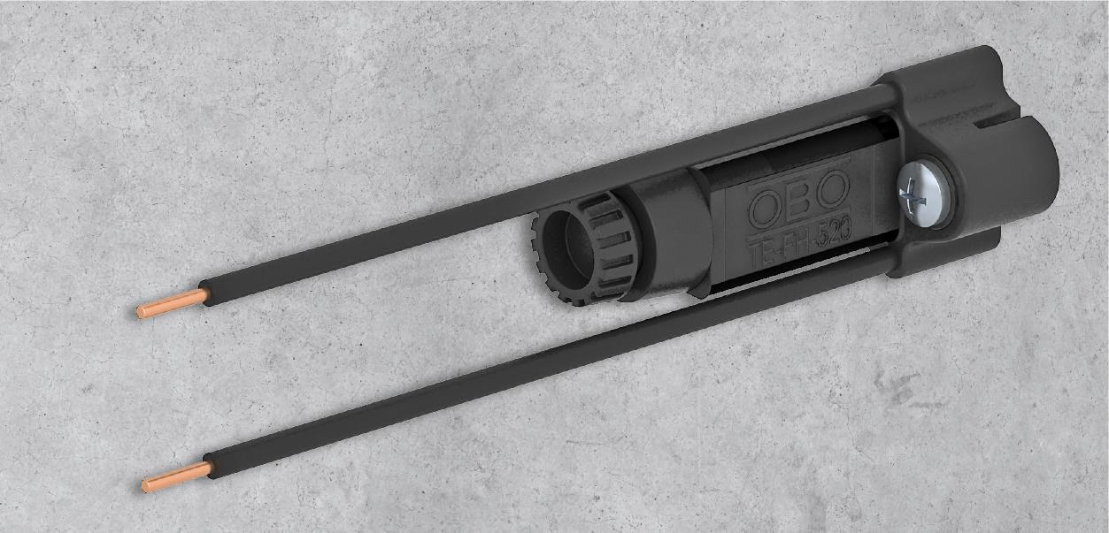 Fuse holder with bayonet lock for fine-wire fuse for dimensions Ø 5 x 20 mm. Connection wires that maintain electrical functionality with nominal cross-section 2.5 mm², ready-stripped. For mounting on one of the exposed domes in the junction box of the FireBox T series using the supplied screw.