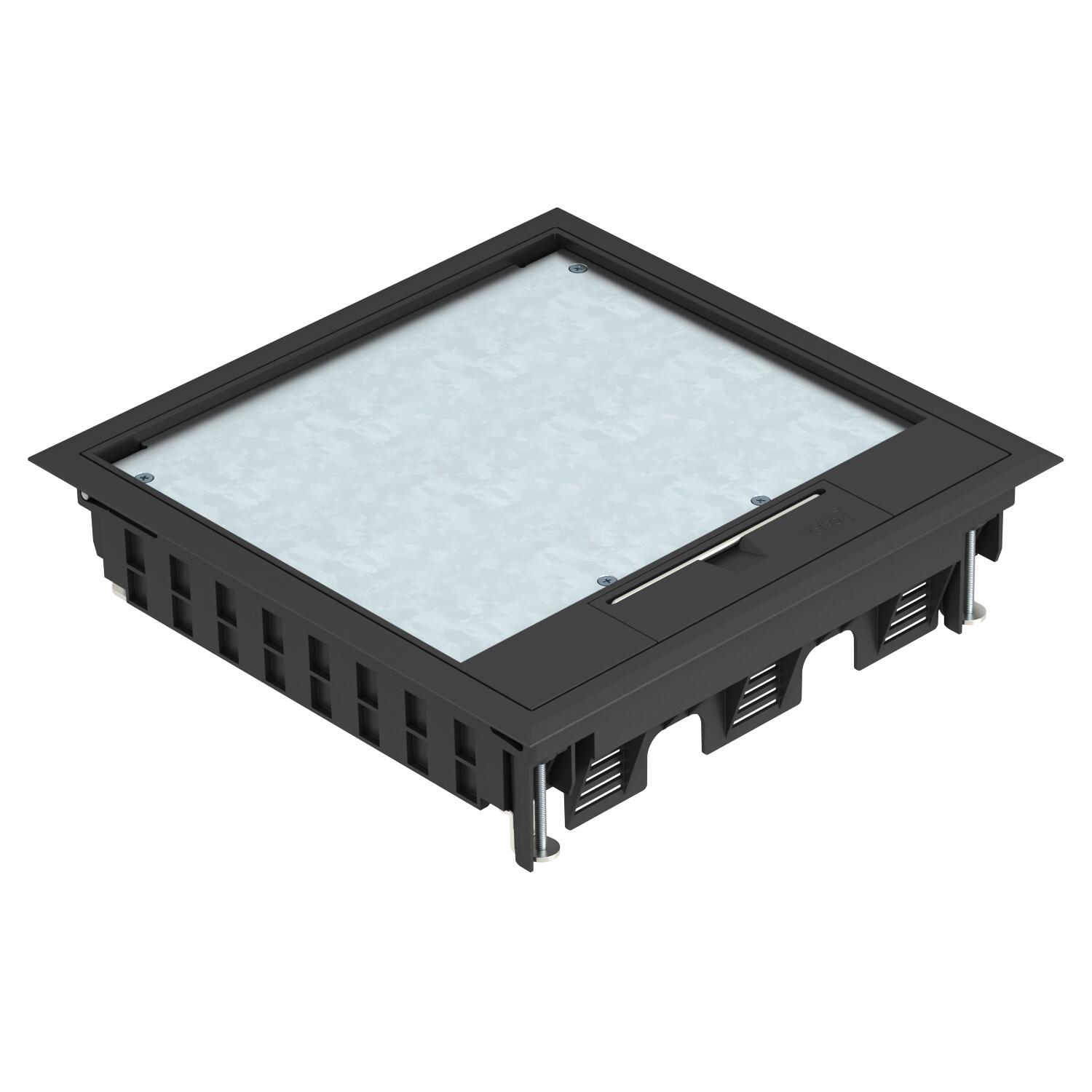 Service outlet with handle clamp, 3-compartment, for the installation of MT9 mounting support. Three type APMT5 cover plates can be installed. Floor covering recess in the hinged cover pre-adjusted to 5 mm, if necessary adjustable to 10 mm.