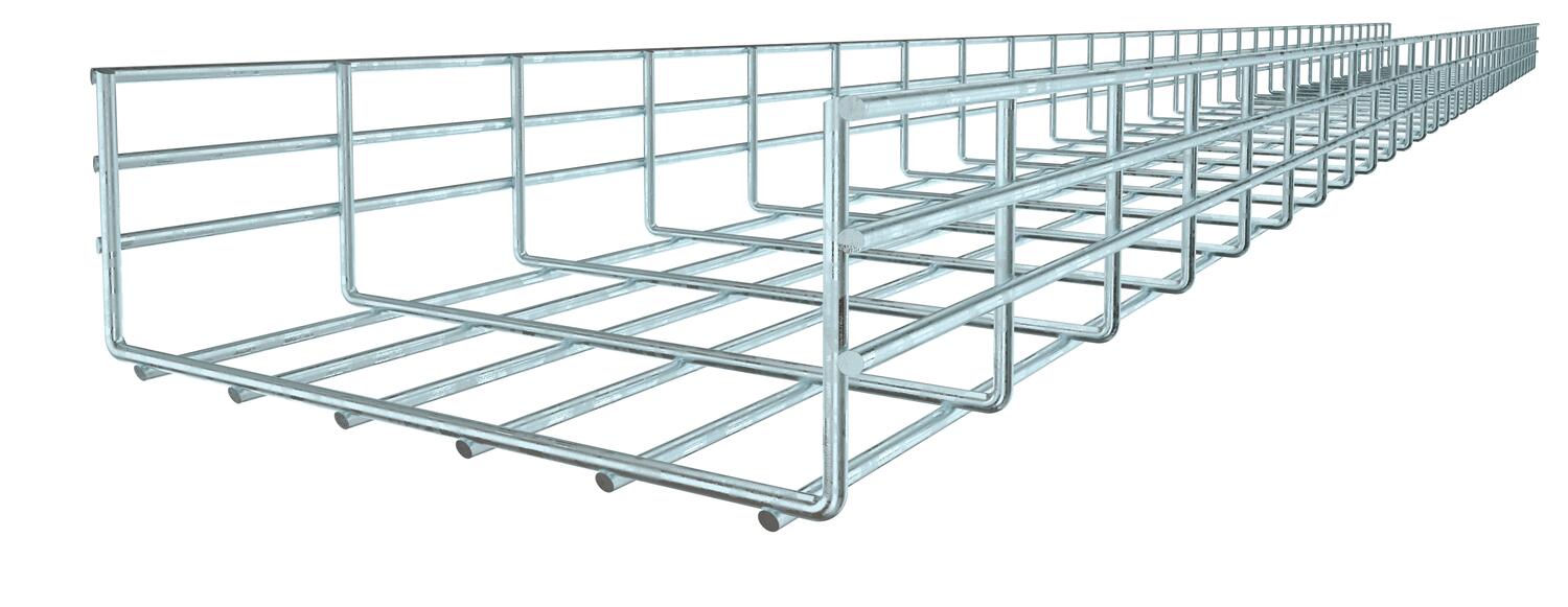 Mesh cable tray made of spot-welded steel wire of side height 105 mm.