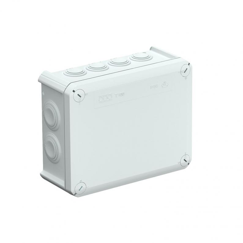 Junction box for the connection of cables and lines indoors and in protected outdoor areas. Rectangular design with plug-in seals to the sides and knock-out entries in the bottom. Suitable for wall and ceiling mounting and on mounting panels. With the option to fasten inside and to mount via the corner domes. Cover with quick lock, sealable. Made from halogen-free and UV-resistant materials.