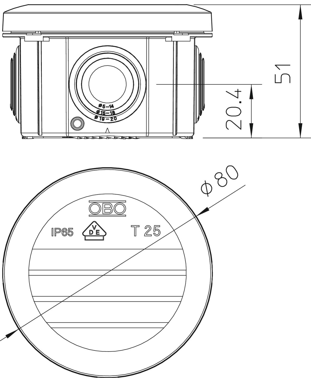 Junction box for the connection of cables and lines indoors and in protected outdoor areas. Round design with plug-in seals to the sides and knock-out entries in the bottom. Suitable for wall and ceiling mounting, on mounting panels and threads in the floor. With the option to fasten inside. With fixed clamping cover. Made from halogen-free and UV-resistant materials. Junction box according to DIN EN 60670. Flame-resistant to DIN EN 60695/2/11, test temperature 650 °C. Impact resistance IK07 according to DIN EN 50102.