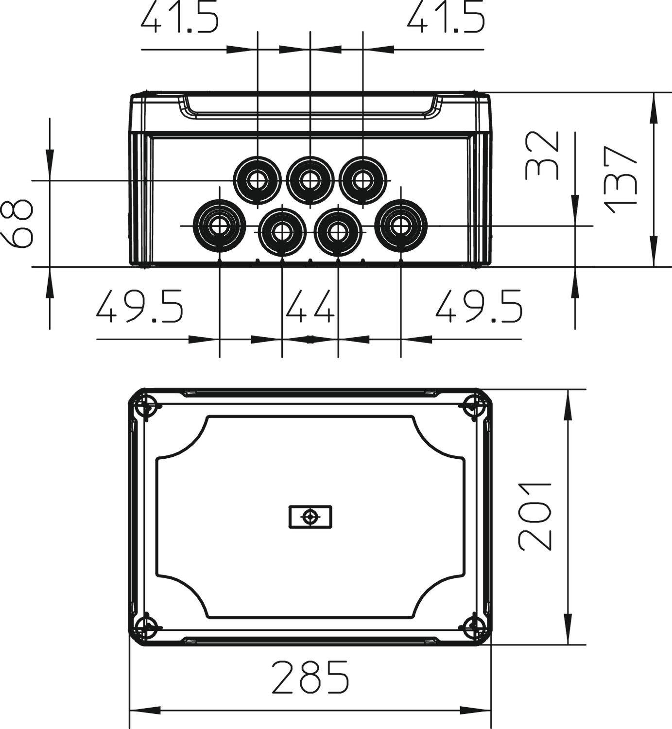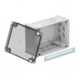 Junction box for the connection of cables indoors and in protected outdoor areas. Rectangular design with plug-in seals. Suitable for wall and ceiling mounting, on mounting panels and threads in the floor. With the option of fastening inside and to mount via the corner domes. High, transparent cover with quick lock, sealable. Made from halogen-free, UV-resistant materials.
