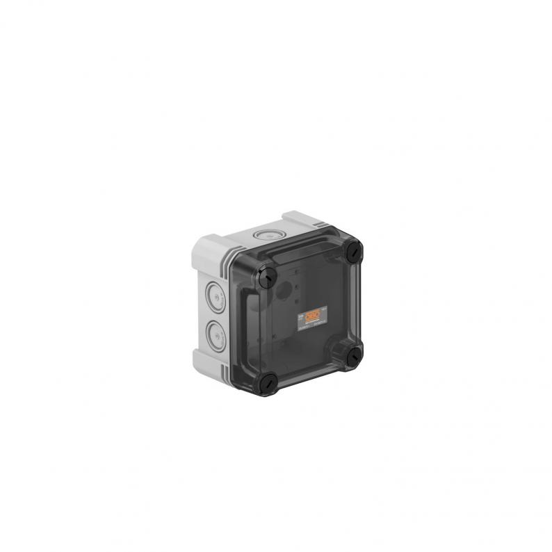 Junction box for the connection of cables and lines indoors and in outdoor areas. Square design with knock-out entries. Suitable for wall and ceiling mounting with the option to fasten outside, inside or to mount via the corner domes. Particularly impact resistant with IK09. Transparent cover with quick lock, sealable. Made from halogen-free and UV-resistant materials.