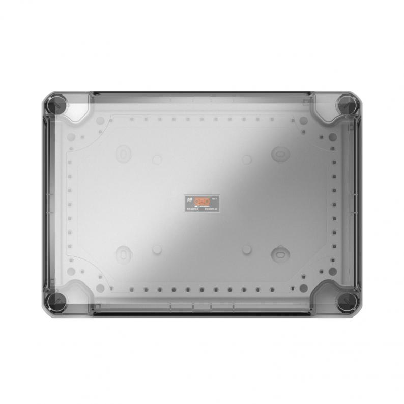 Junction box for the connection of cables and lines indoors and in outdoor areas. Rectangular design with knock-out entries. Suitable for wall and ceiling mounting with the option to fasten outside, inside or to mount via the corner domes. Particularly impact resistant with IK08. Transparent cover with quick lock, sealable. Made from halogen-free and UV-resistant materials.