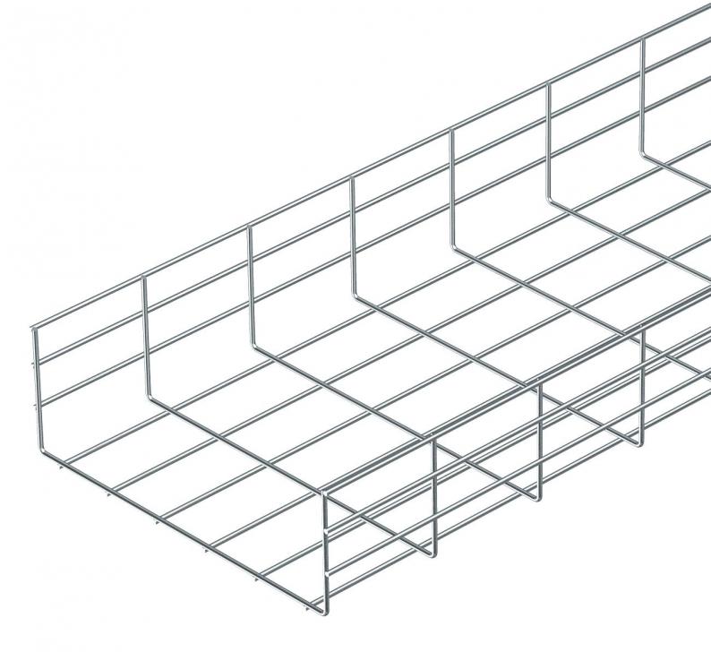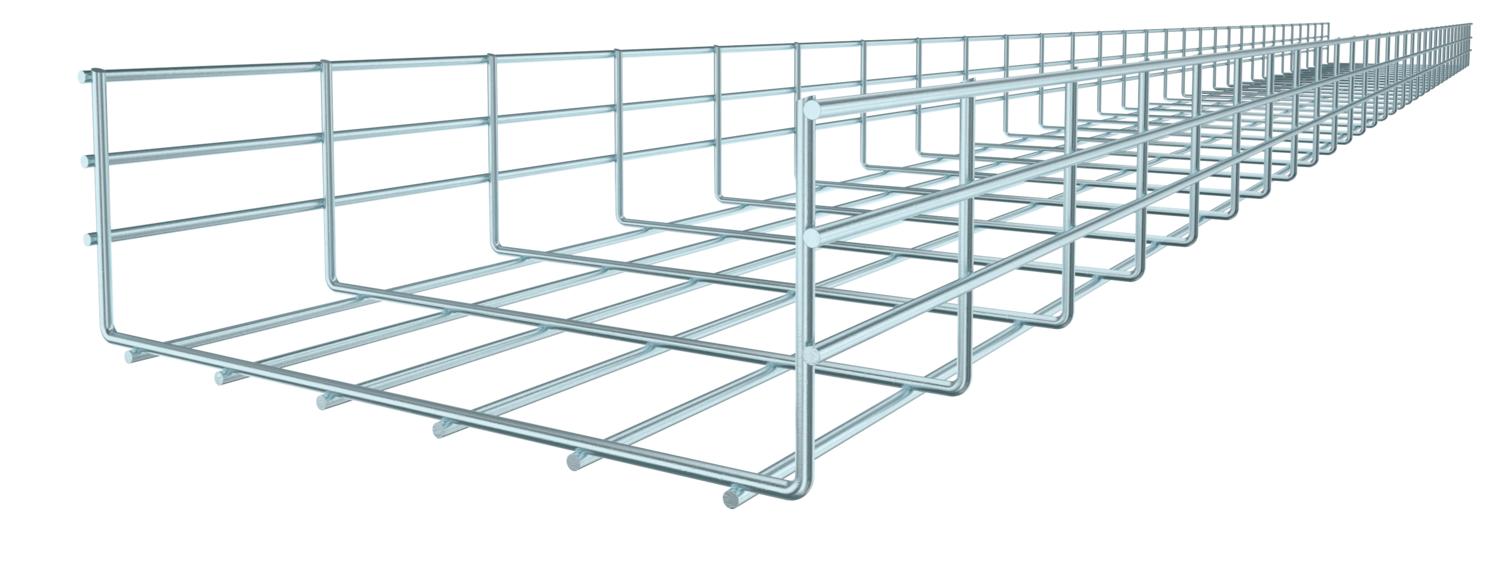 Mesh cable tray made of spot-welded steel wire of side height 105 mm.