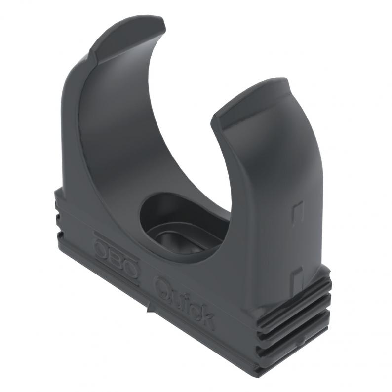 Flush-mounted clip to accept metric steel armoured pipes and heavy-duty insulating pipes, as well as Quick-Pipe® electrical installation pipes. Universal fastening options on walls and ceilings, both in indoor and protected outdoor areas. With slot for side alignment during mounting with wood screw or knock-in anchor. Toolless pipe mounting. Can also be arranged with OBO Multi-Quick or proQuick clip. M16 - M32 size can be screwed onto M6 thread. Recommended fastening spacing 50–60 cm, for max. extraction values F at a room temperature of 20 °C, see the table.